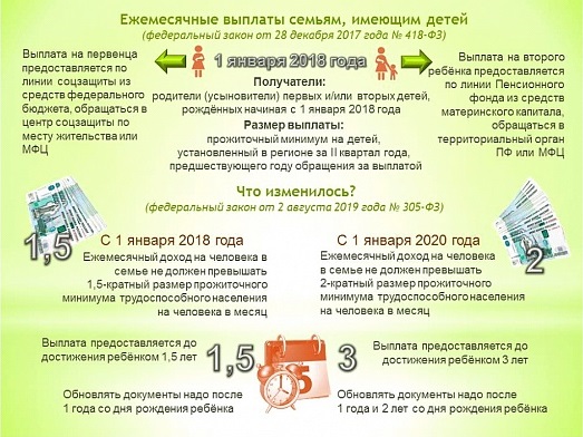 С 1 января 2020 года вступает в силу Федеральный закон № 305-ФЗ «О внесении изменений в Федеральный закон «О ежемесячных выплатах семьям, имеющим детей». Этот закон расширяет круг получателей ежемесячной выплаты из материнского капитала. Согласно положениям право на получение выплаты будут иметь семьи, в которых среднедушевой доход не превышает двукратную величину прожиточного минимума (ПМ) трудоспособного населения в регионе (сейчас требования к доходу – не более 1,5-кратной величины ПМ). Помимо этого, ежемесячная выплата из средств материнского капитала будет осуществляться до достижения ребенком трех лет (сейчас до полутора лет).