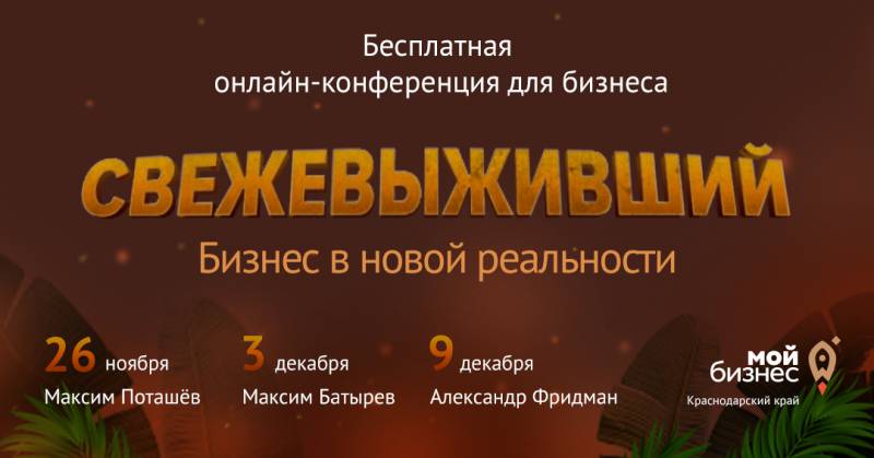 - Предприниматель 2020 года - это уже целое явление. Выстраивать систему заново и вести бизнес сложно. Мы готовы поддерживать таких предпринимателей. Конференция будет посвящена бизнесу в эпоху коронавируса и будет полезна тем, кто готов восстановить свои позиции или готов рискнуть и запустить свой проект в непростое время – прокомментировал руководитель департамента инвестиций и развития малого и среднего предпринимательства Краснодарского края - Василий Воробьев. Он-лайн мероприятия состоятся 26 ноября, 3 декабря и 9 декабря. Три дня конференции будут посвящены разным темам: «Управление в мире хаоса», «Управление командой в новой реальности» и «Мышление предпринимателя 2020». Приглашенные спикеры – представители бизнеса и первые лица известных компаний: четырехкратный обладатель приза «Хрустальная сова», консультант в сфере продаж, маркетинга и управления – Максим Поташев, известный российский менеджер, обладатель премий «Коммерческий директор года» – Максим Батырев, управляющий партнёр консалтинговой компании «Amadeus Group» – Александр Фридман. На трех виртуальных сценах конференции выступят и дадут инструменты для выживания представители ведущих компаний: Юлия Галынская – руководитель студии брендинга yulize.com, Максим Фролов – генеральный директор (CEO) в Red Forward Group, Иван Труфанов – Customers Support, Бирюков Алексей – основатель Andata, Дмитрий Зацепин – основатель «Oil Energy», Елена Ипатова – сооснователь сыроварни «Ипатов», Олег Сирота – бренд Русский пармезан, Гузель Санжапова – предприниматель, развивающий деревню Малый Турыш, чью продукцию закупает IKEA, Оксана Пикулева – преподаватель программ Executive MBA по теме: трансформации мышления, Эдуард Гуринович – предприниматель из списка Forbes, создатель онлайн-платформы CarPrice представители компаний Aliexpress,Tiktok Для участия в онлайн-конференции «Свежевыживший. Бизнес в новой реальности» обязательна регистрация на сайте: свежевыживший.рф. В мероприятии бесплатно могут принять участие физические лица, заинтересованные в начале осуществления предпринимательской деятельности на территории Краснодарского края (в возрасте от 18 лет), а также субъекты малого и среднего предпринимательства, зарегистрированные на территории Краснодарского края. За подробностями обращаться по телефону центра «Мой бизнес» 8 (861) 992-03-68. Мероприятие проводится с целью популяризации предпринимательства в Краснодарском крае Фондом развития бизнеса Краснодарского края при поддержке департамента инвестиций и развития малого и среднего предпринимательства Краснодарского края. Программа. | |