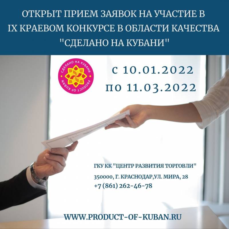 10 января 2022 г. стартовал прием заявок на участие в IX краевом конкурсе в области качества "Сделано на Кубани" |